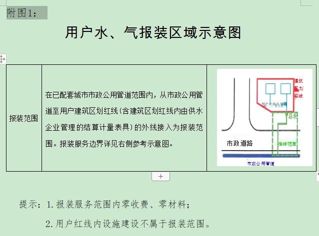 在已配套城市市政公用管道范圍內(nèi),從市政公用管道至用戶建筑區(qū)劃紅線的外線接入為報(bào)裝范圍。供水、供氣企業(yè)的投資界面必須延伸至用戶建筑區(qū)劃紅線,紅線外連接工程由供水、供氣企業(yè)負(fù)責(zé),用戶“零成本”不需要投資。施工結(jié)束后,供水、供氣企業(yè)按指定標(biāo)準(zhǔn)恢復(fù)市政道路和園林綠化。